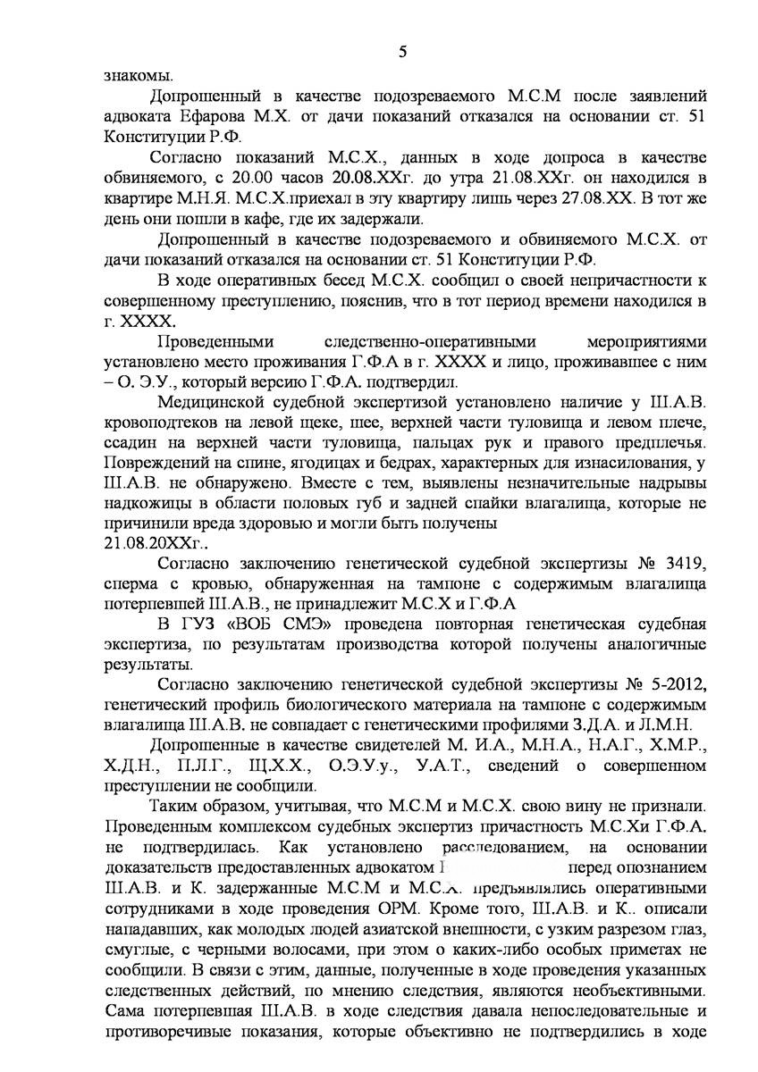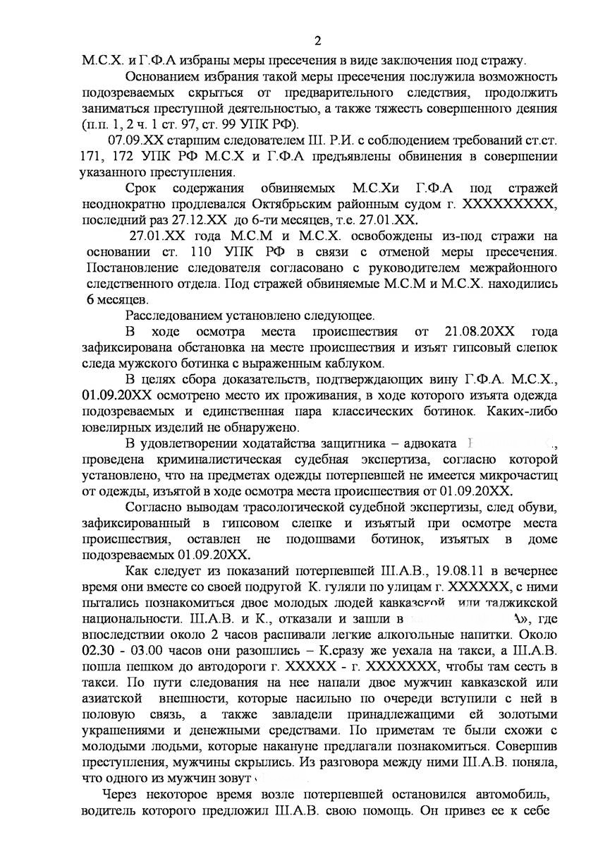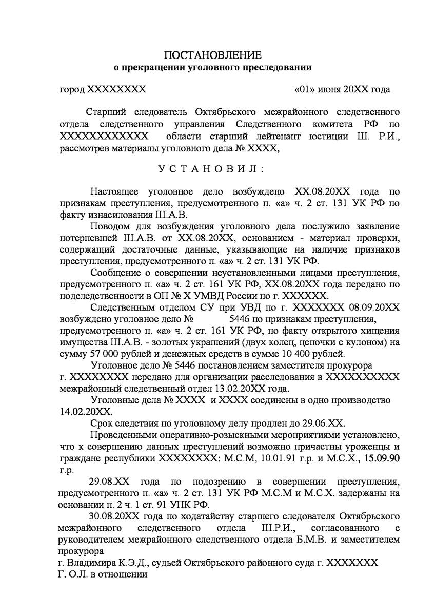 Адвокат на Щербинке добился прекращения уголовного дела на стадии предварительного расследования по реабилитирующим основаниям в отношении двух граждан иностранного государства обвиняемых органами предварительно следствия в совершении преступления предусмотренного п. «а» ч.2 ст.131 УК РФ (изнасилование совершенное группой лиц) и п."а" , п."г" ч.2 ст.161 УК РФ (грабёж), наказание за которое предусматривает лишение свободы от восьми до пятнадцати лет, то есть преступление, которое в соответствии с ч.5 ст.15 Уголовного Кодекса Российской Федерации отнесено к категории особо тяжких преступлений.